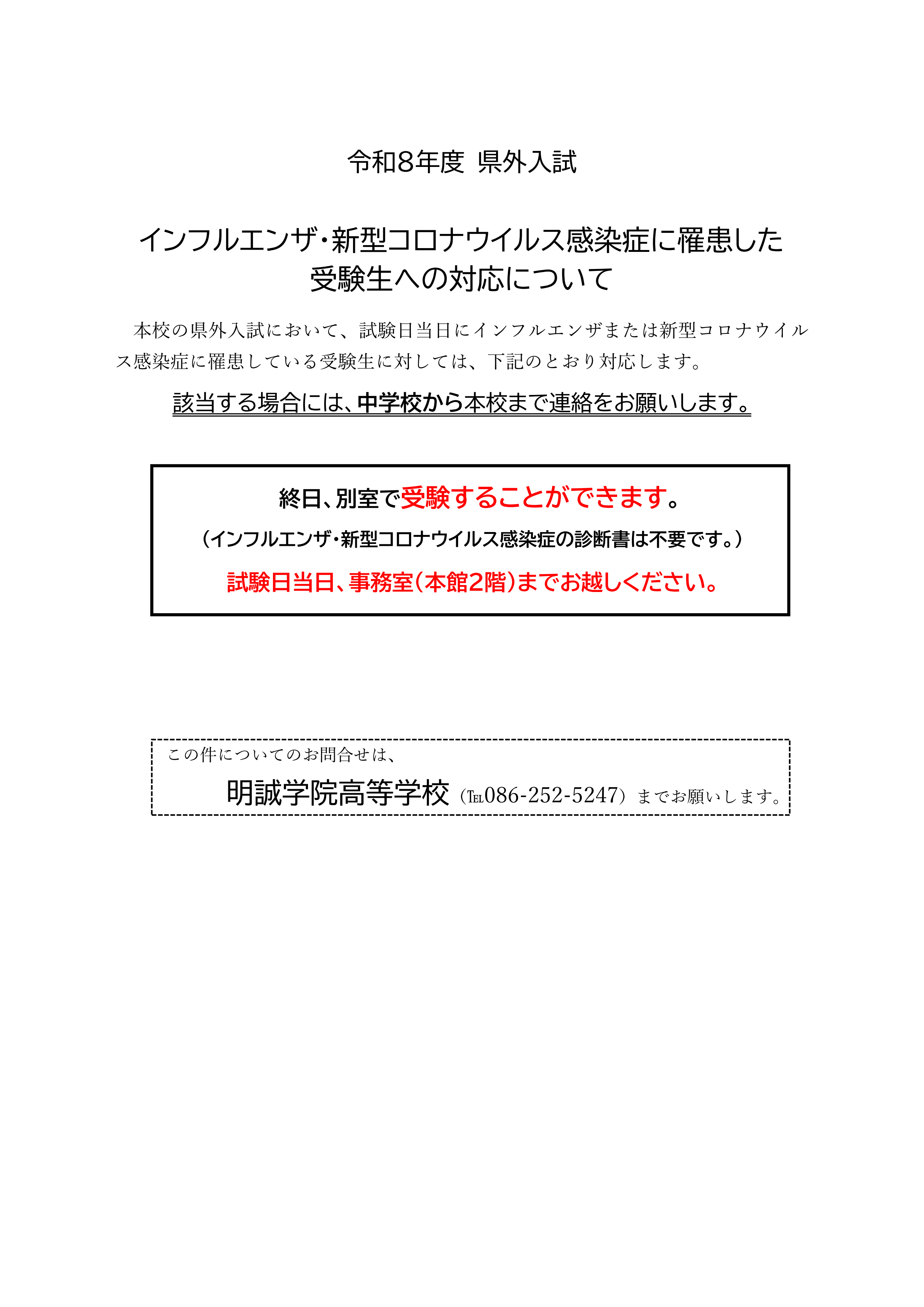 令和8年度 県外入試 インフルエンザ・新型コロナウィルス感染症に罹患した受験生への対応について