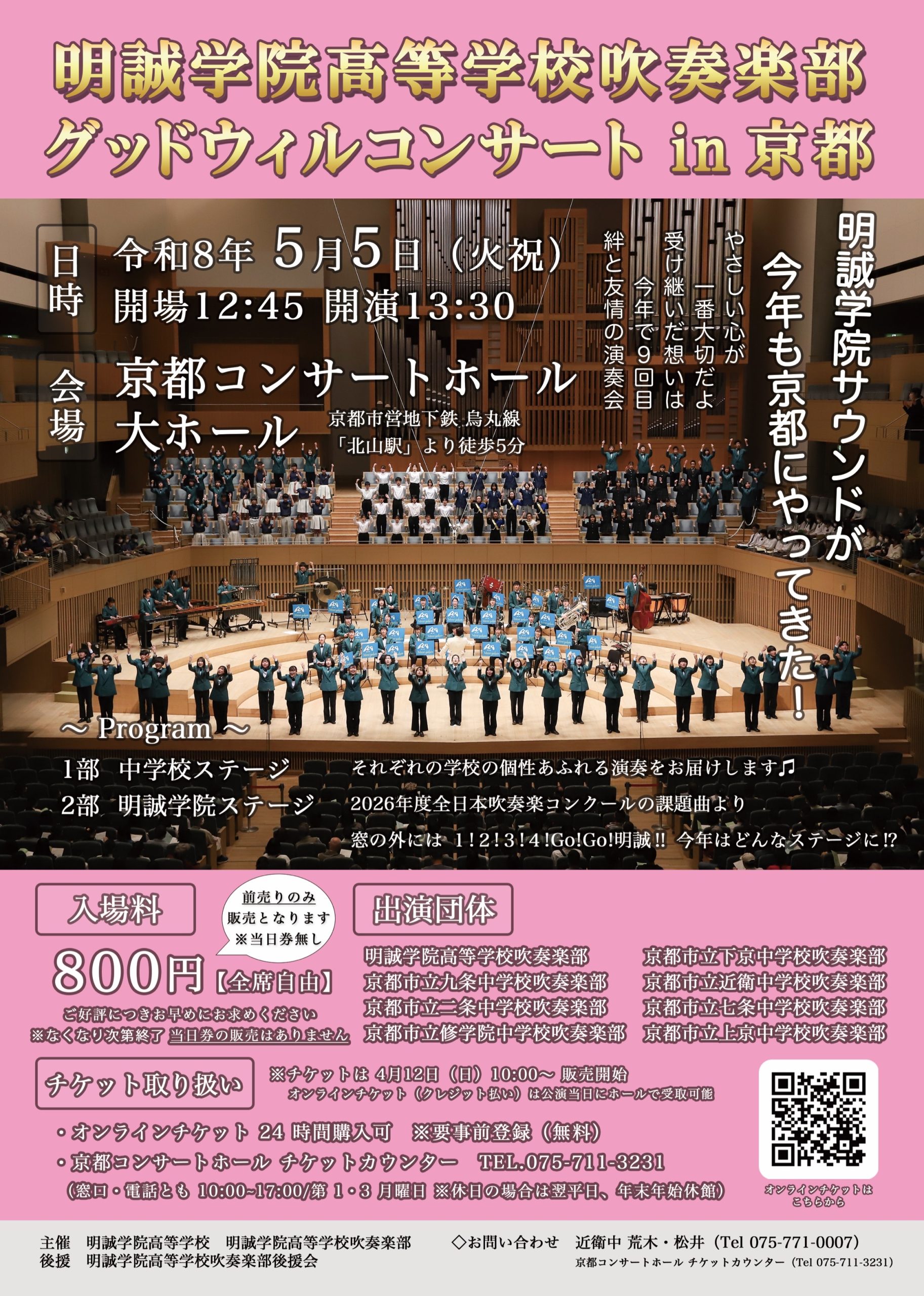 当日は地元京都の中学校吹奏楽部も参加し、それぞれの学校の個性あふれる演奏をお届けします。本校吹奏楽部の演目は、2026年度全日本吹奏楽コンクール課題曲のほか、生徒構成メドレー『1.2.3.4!GO!GO!明誠』、『窓の外には』などです。皆様のご来場を心よりお待ちしております♪