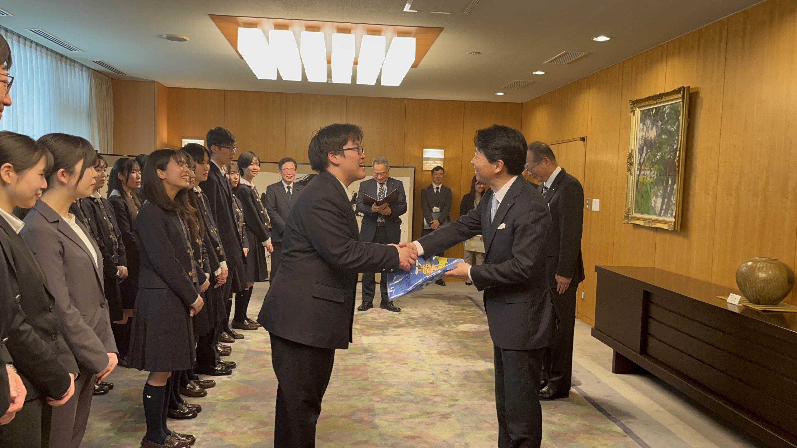 岡山県庁では部長の赤木進次郎さん(3年・岡山市立光南台中出身)から伊原木知事に「今年もここでご挨拶と良い報告ができることをうれしく思います。上級生と下級生がお互いに声を掛け合い、切磋琢磨できたことが様々な成果につながったと思います。支えてくださった多くの方に感謝しています。」と伝えると、知事からは「今年もここで皆さんの努力の成果を見ることができて大変うれしく思う。特に若いエネルギーがいっぱい詰まった作品からは私たちも影響されます。」などとねぎらいの言葉をいただきました。