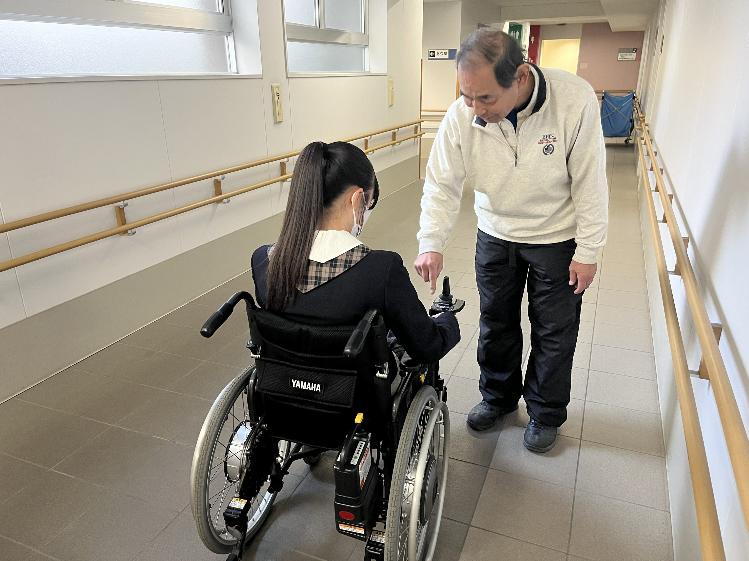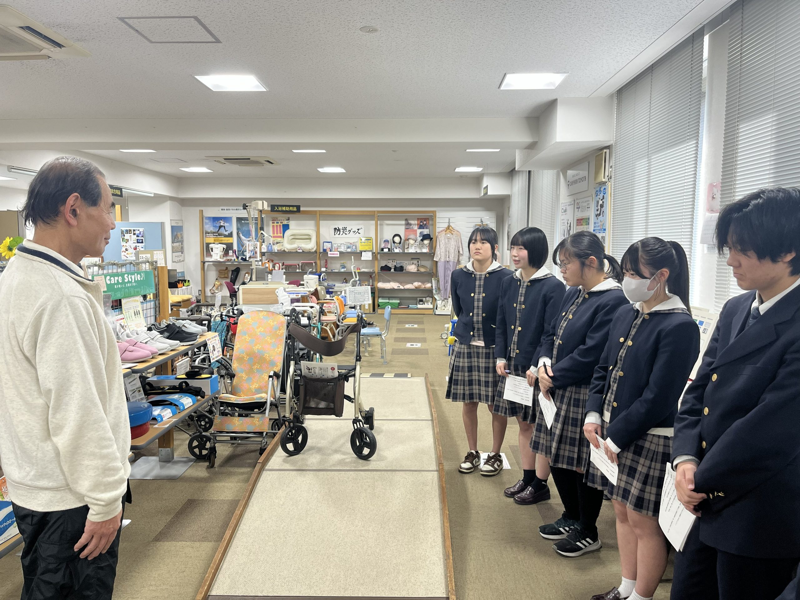 最初に見学したのは、「福祉用具展示コーナー」です。福祉用具についての説明を受け、電動車いすの試乗や、ベッド用リフトの操作体験を行いました。生徒たちは、普段乗る機会のない電動車いすの操作性に驚きつつも、楽しみながらその利便性を体感していました。また、講義の中では以下の重要な視点を学びました。