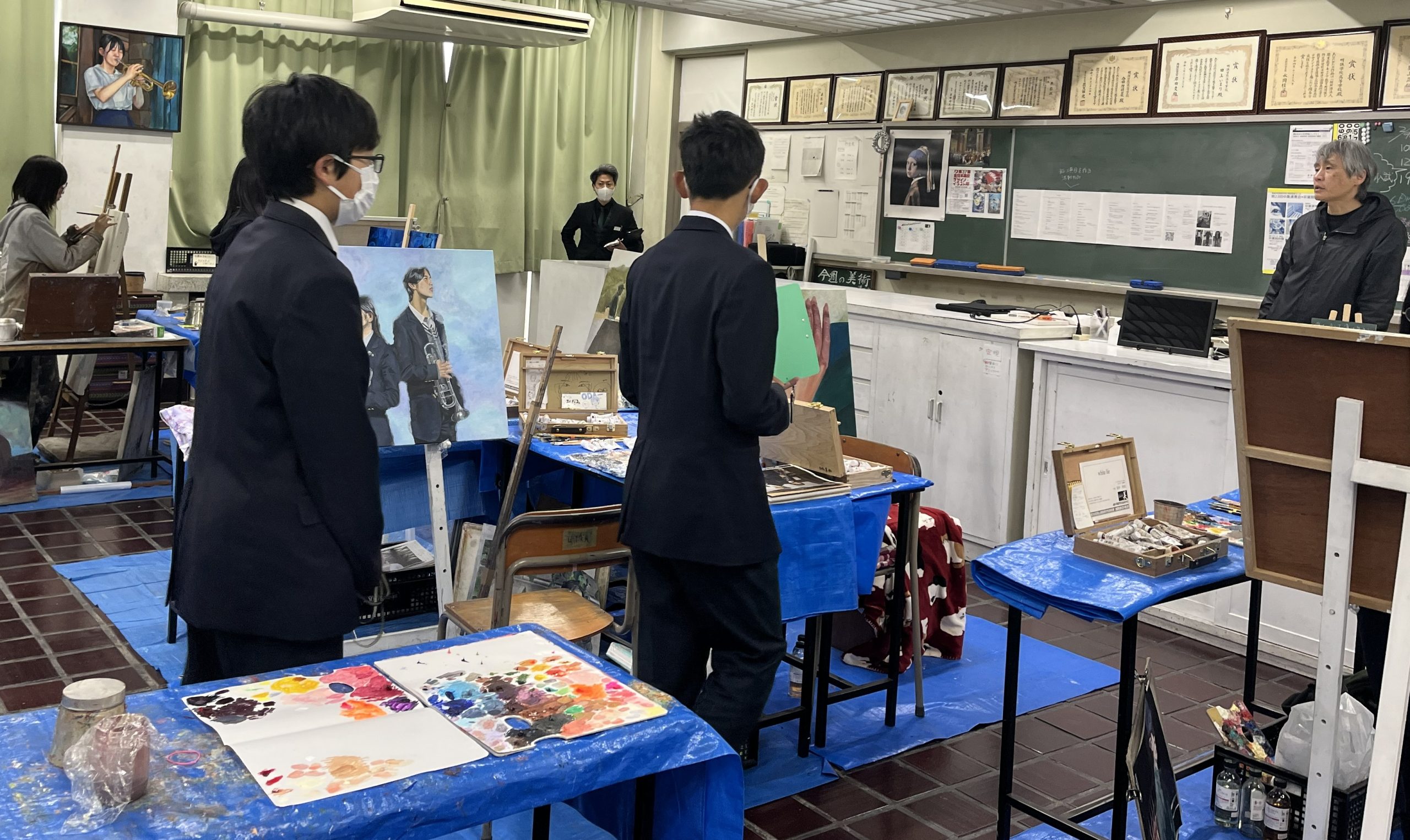 食堂や授業中の教室の様子に加え、内閣総理大臣賞や文部科学大臣賞を受賞している美術部・書道部の活動など、本校の特色ある施設や教育活動をご覧いただきました。