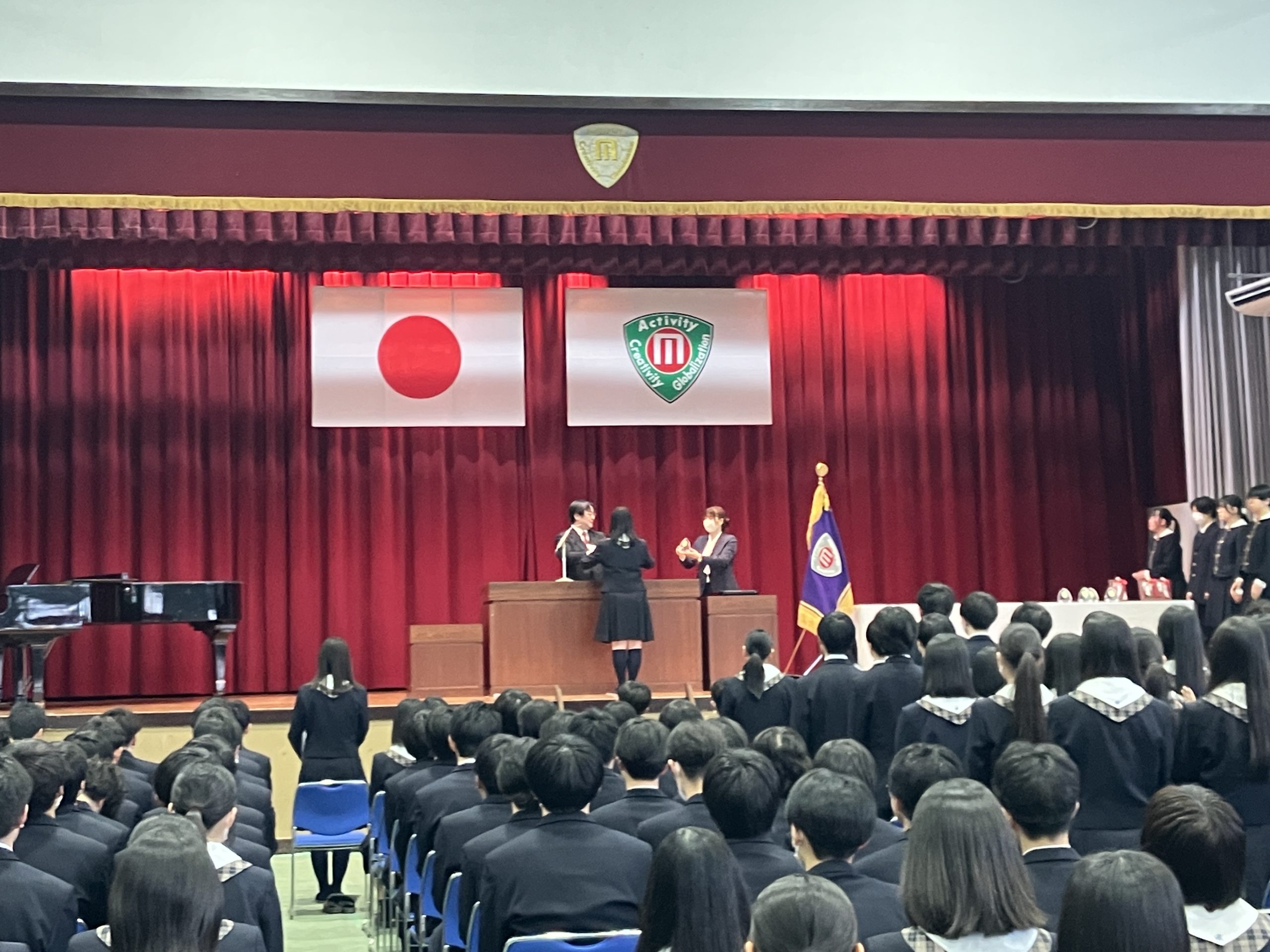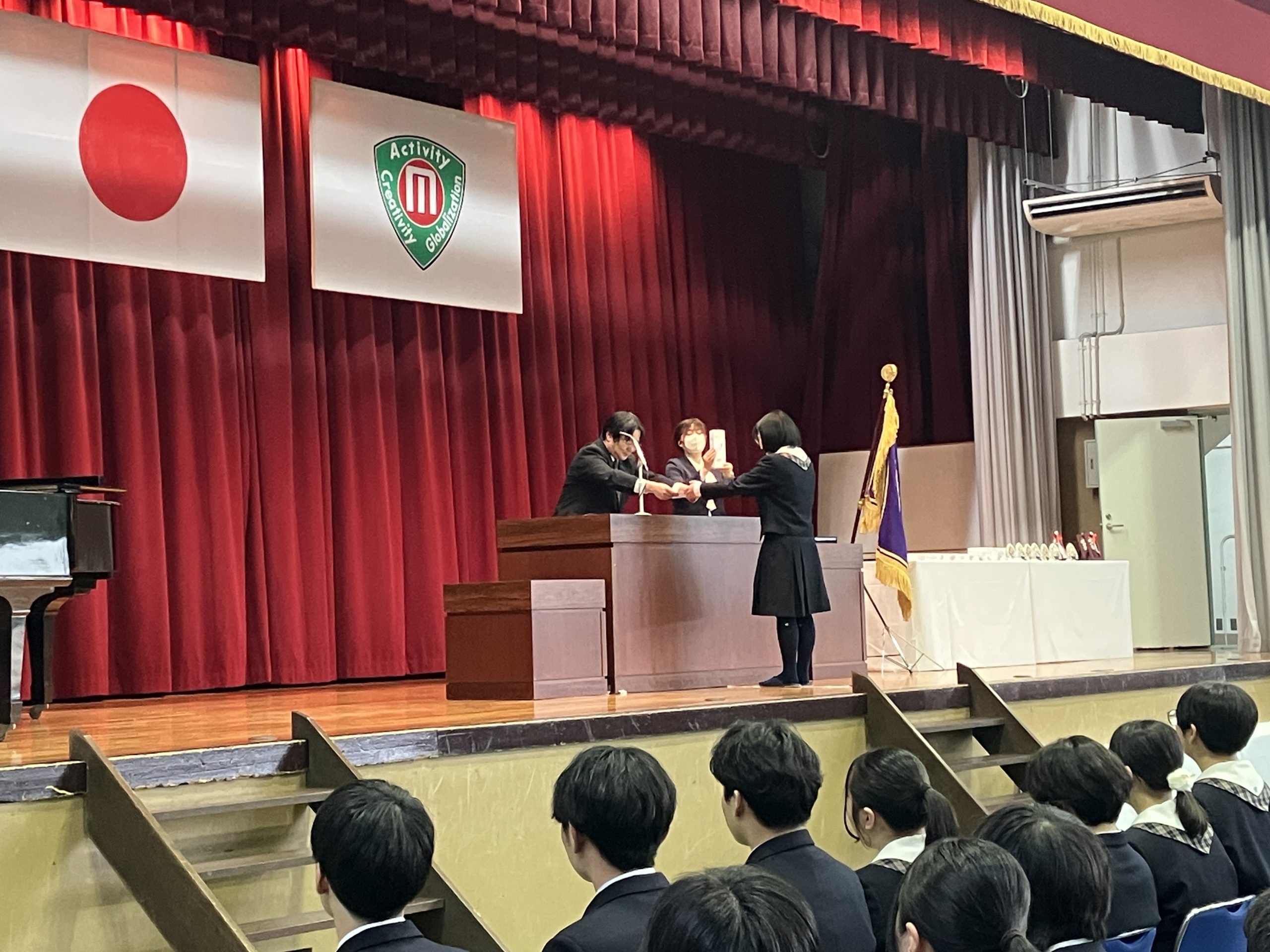 厳粛な雰囲気ではじまった表彰式では校長の吉田先生から、学校賞、皆勤賞、精勤賞などに該当する生徒、部活動で全国大会、中国大会に出場し活躍した生徒たちがそれぞれの努力と成果に対して表彰を受けました。