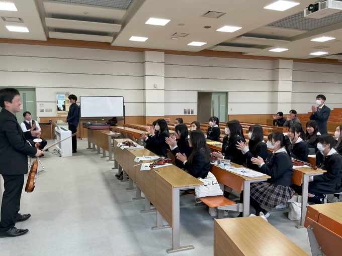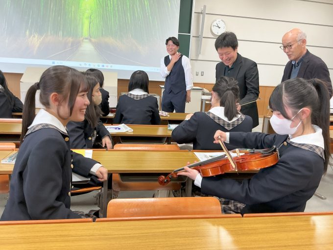 はじめに、大学での活動や研究の特徴、高校での学習との違い、入試制度について詳しい説明を受けました。その後、保健福祉学部での学びについて紹介していただき、大学生の方に直接質問する時間も設けていただきました。また、バイオリンを弾く体験など、大学ならではの多様な活動を体験することができました。