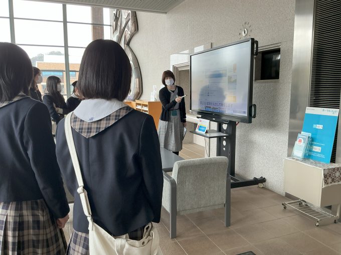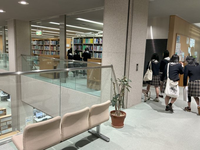 続いて、岡山県立大学附属図書館を見学し、個別学習スペースやグループ学習スペースなど、機能的に整えられた学習環境について説明を受けました。