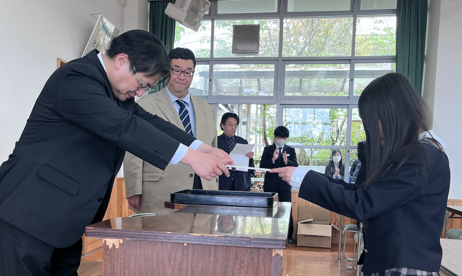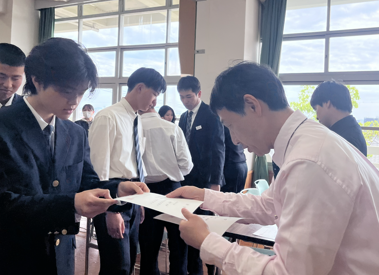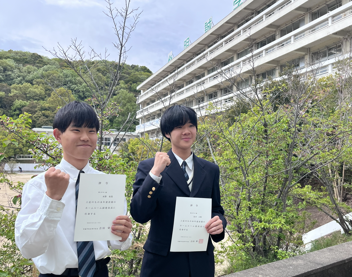 4月14日(火)、正副委員長任命式を行いました。 各クラスで行われた委員長・副委員長選挙で選ばれた1年生から3年生の生徒が集まり、校長の吉田先生より今年度のホームルーム委員長および副委員長として任命されました。 2年生の安井大智さん(岡山市立桑田中出身)は「今年度は昨年以上にみんなが過ごしやすいクラスにしたい。先生と生徒の連携を意識していきます。」と意気込みを表してくれました。
