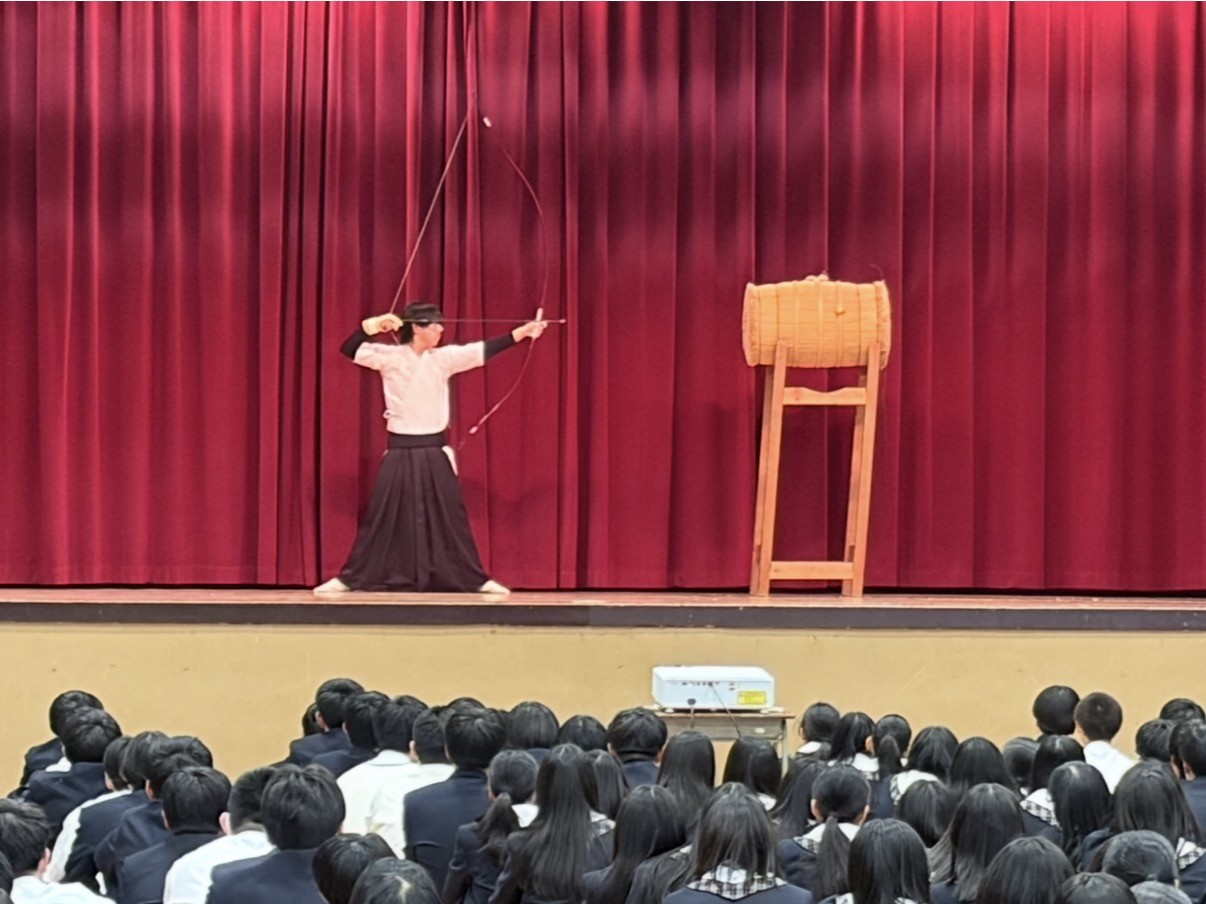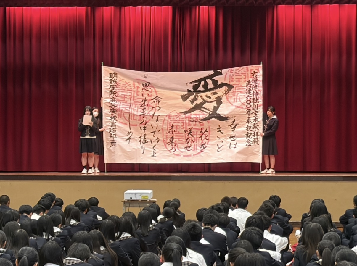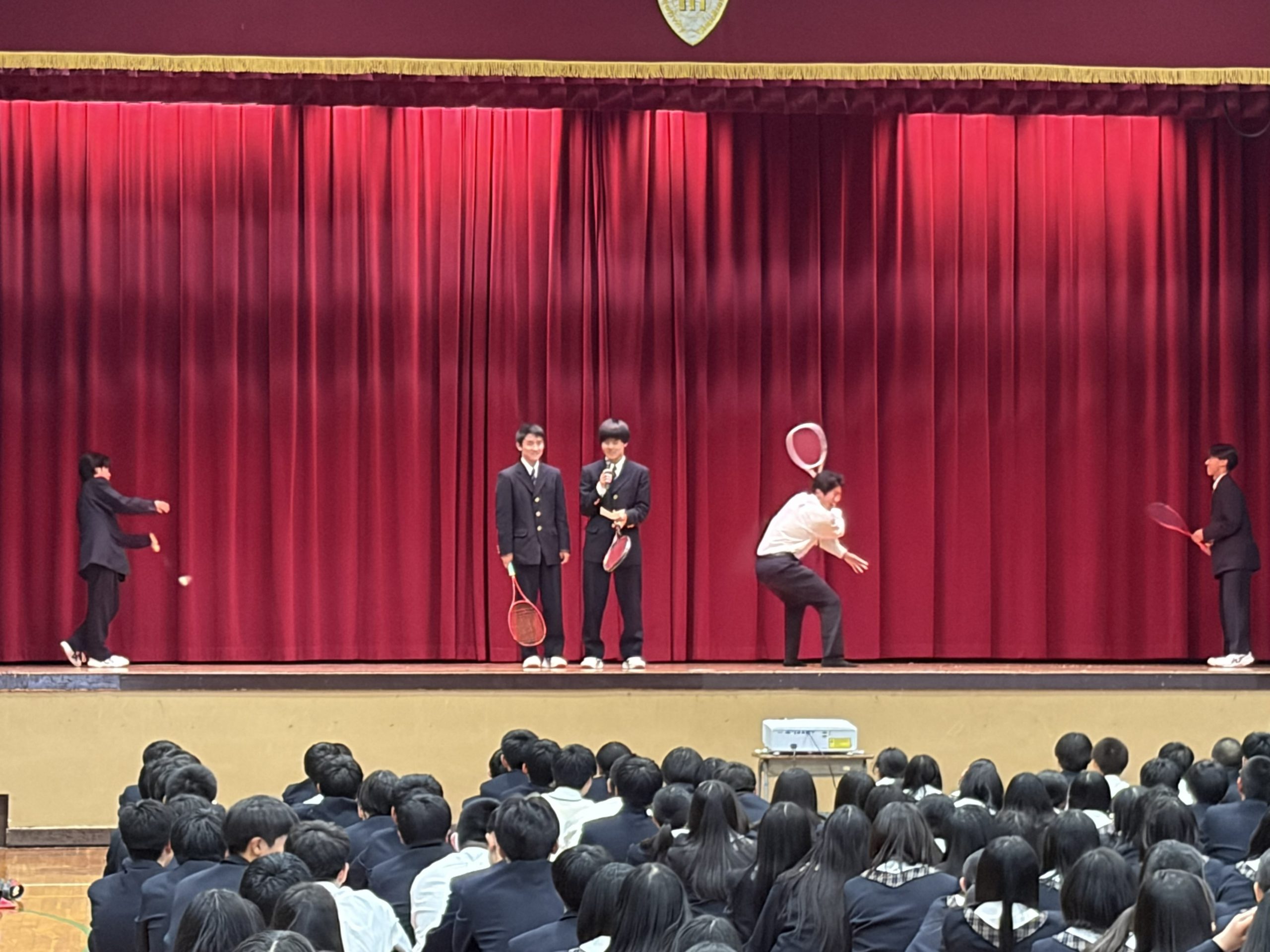 文化部・運動部に在籍する2、3年生が部活動の内容や大会の実績など部活動の魅力を伝え、加入を呼びかけました。生徒会長の亀山峨空さん(岡山市立高松中出身)からは「ぜひ、素敵な高校時代の思い出のために、何かの部に入って頑張ってください。部活動に打ち込むことで素晴らしい仲間に出会えたり、もっと輝いた自分になれたりします。部活動をしている時、みんな瞳が輝いています。1年生のみなさん、ここで自分の青春と出会ってください。」とあいさつがありました。