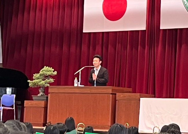 最後に寺迫麟さん(令和2年度進学総合コース卒)を講師としてお迎えし、「挫折も大切な通過点」と題した講演が行われました。講演では、多くの失敗、挫折を乗り越える過程の大切さについて、「これまでの自分がこれからの自分をつくる。成功や失敗にとらわれず、今できること、やりたいことに全力で取り組んでほしい」と語られ、後輩たちの今後の歩みを力強く後押しする言葉が贈られました。先輩の実体験に基づく講話は、生徒一人ひとりの心に深く響くものとなりました。
