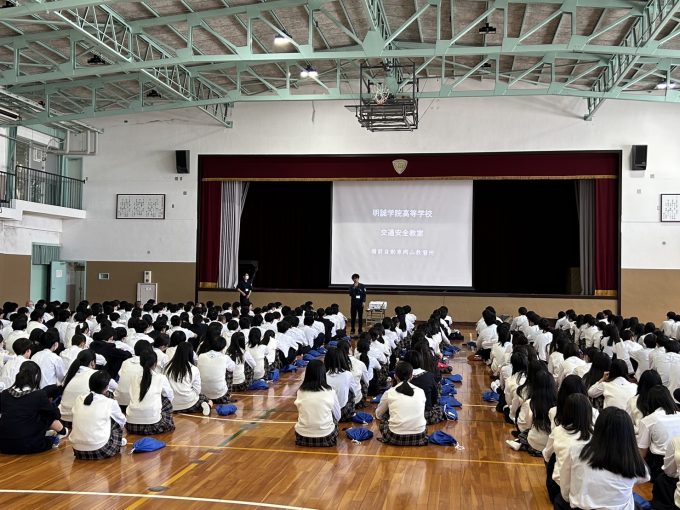 備前岡山自動車教習所からお越しいただいた講師の方に、体育館で岡山県の交通事情や自転車事故の事例等をご紹介いただきました。