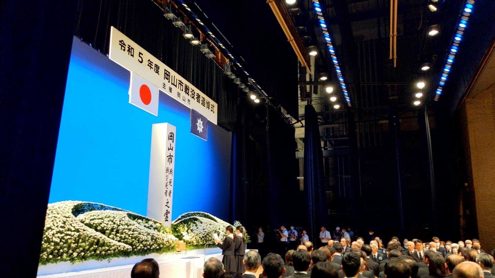 6月29日(木)、岡山市主催の令和5年岡山市戦没者追悼式に、社会部の草野稀音さん(3年・岡山市立操南中出身)と佐藤初音さん(3年・岡山市立京山中出身)が、青少年代表として参列し、「追悼のことば」を述べました。岡山空襲で亡くなられた方々とそのご遺族に対して、哀悼の意を捧げるとともに、戦争の悲惨さを後世に伝え、平和で豊かな世界を築いていく決意を表明しました。